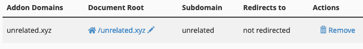 Once I’d registered both domains, I created a cPanel hosting account with Domain Name Sanity for sslexample.com, and then added unrelated.xyz as an Addon Domain, per the screenshot below – which shows the subdomain “unrelated” that was created for the addon domain “unrelated.xyz”. This subdomain name is important, which you’ll see later.