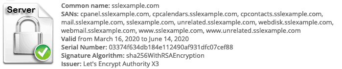 Below is the details of the SANs (Subject Alternative Names) in the certificate for sslexample.com, our primary domain for the cPanel account: